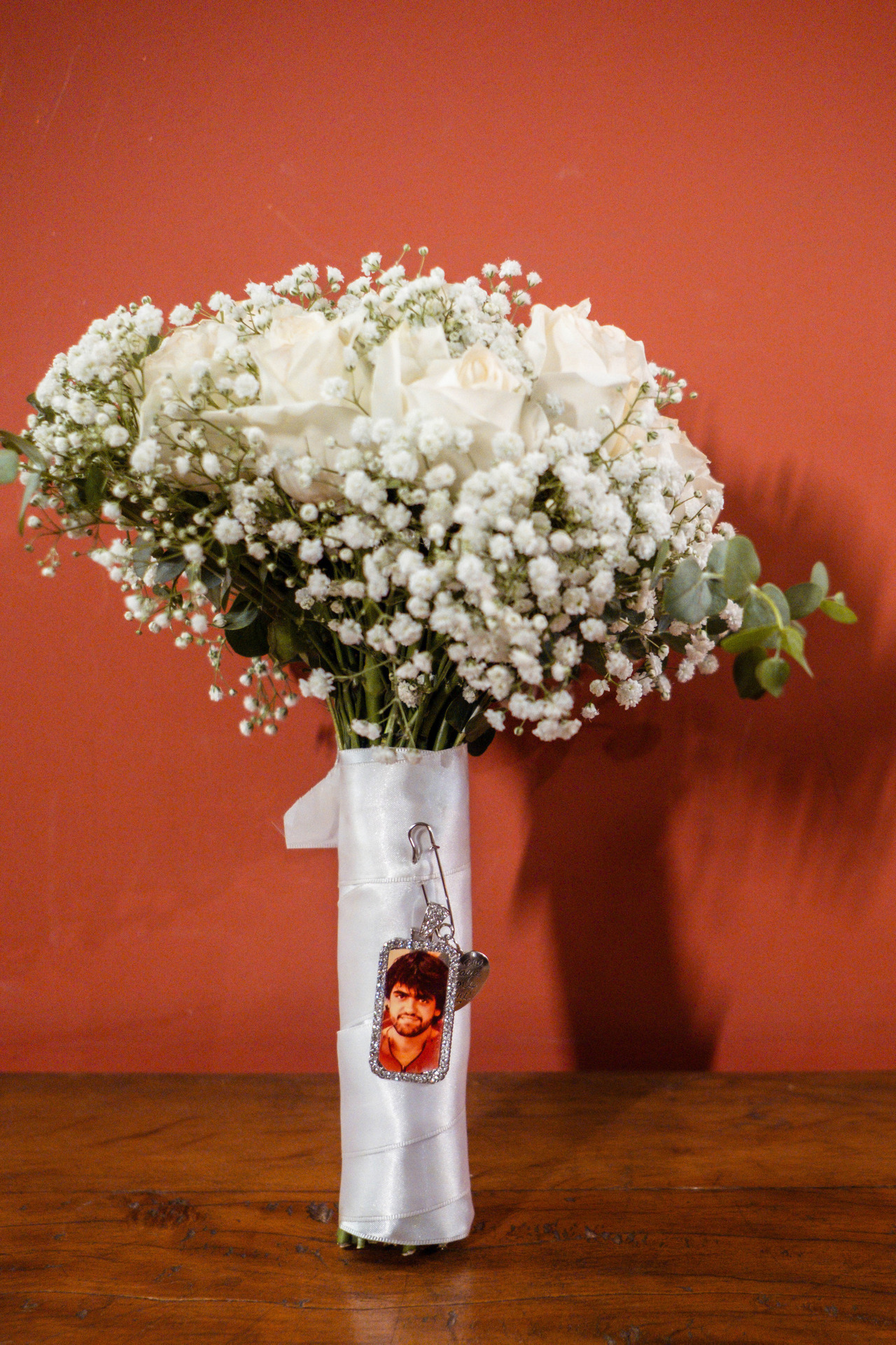 Nesta foto, vemos o buquê — mas não é apenas o buquê: é a participação do pai em um momento tão único e especial na vida dela.