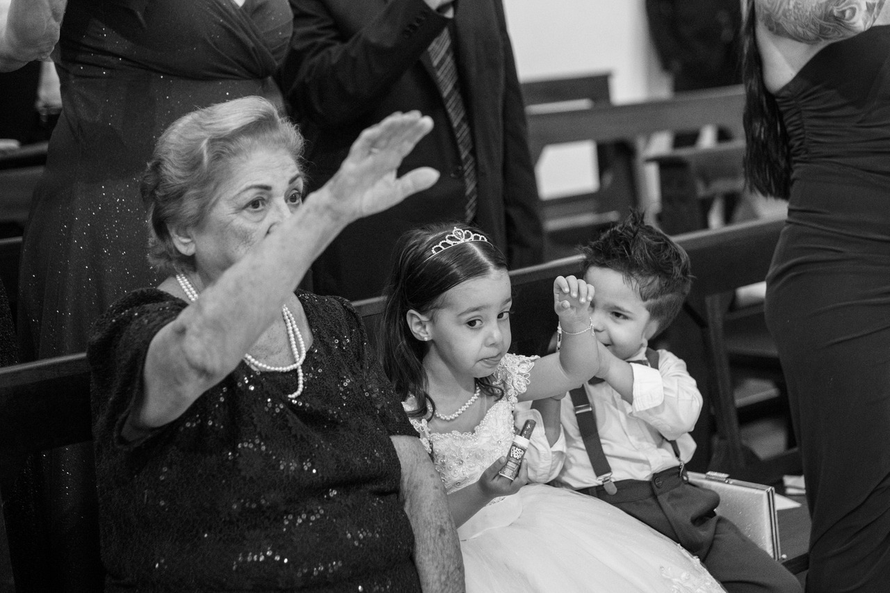 A seguinte é uma das minhas favoritas: a pureza das crianças brincando, o dog sendo acalmado para entrar com as alianças, o garotinho se distraindo durante a oração e as avós cochichando baixinho algo que ficou só entre elas...